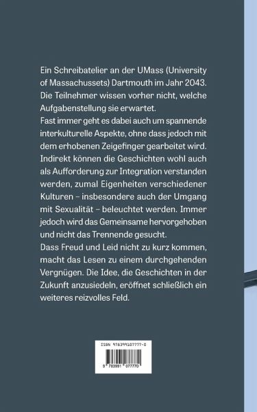 Ein Schreibatelier an der UMass (University of Massachussets) Dartmouth im Jahr 2043. Die Teilnehmer wissen vorher nicht, welche Aufgabenstellung sie erwartet.Fast immer geht es dabei auch um spannende interkulturelle Aspekte, ohne dass jedoch mit dem erhobenen Zeigefinger gearbeitet wird. Indirekt können die Geschichten wohl auch als Aufforderung zur Integration verstanden werden, zumal Eigenheiten verschiedener Kulturen - insbesondere auch der Umgang mit Sexualität - beleuchtet werden. Immer jedoch wird das Gemeinsame hervorgehoben und nicht das Trennende gesucht.Dass Freud und Leid nicht zu kurz kommen, macht das Lesen zu einem durchgehenden Vergnügen. Die Idee, die Geschichten in der Zukunft anzusiedeln, eröffnet schließlich ein weiteres reizvolles Feld.