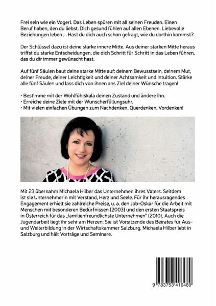 Frei sein wie ein Vogerl. Das Leben spüren mit all seinen Freuden. Einen Beruf haben, den du liebst. Dich gesund fühlen auf allen Ebenen. Liebevolle Beziehungen leben ... Hast du dich auch schon gefragt, wie du dorthin kommst? Der Schlüssel dazu ist deine starke innere Mitte. Aus deiner starken Mitte heraus triffst du starke Entscheidungen, die dich Schritt für Schritt in das Leben führen, das du dir immer gewünscht hast. Auf fünf Säulen baut deine starke Mitte auf: deinem Bewusstsein, deinem Mut, deiner Freude, deiner Leichtigkeit und deiner Achtsamkeit und Intuition. Stärke alle fünf Säulen und lass dich von ihnen ans Ziel deiner Wünsche tragen! - Bestimme mit der Wohlfühlskala deinen Zustand und ändere ihn. - Erreiche deine Ziele mit der Wunscherfüllungsuhr. - Mit vielen einfachen Übungen zum Nachdenken, Querdenken, Vordenken!