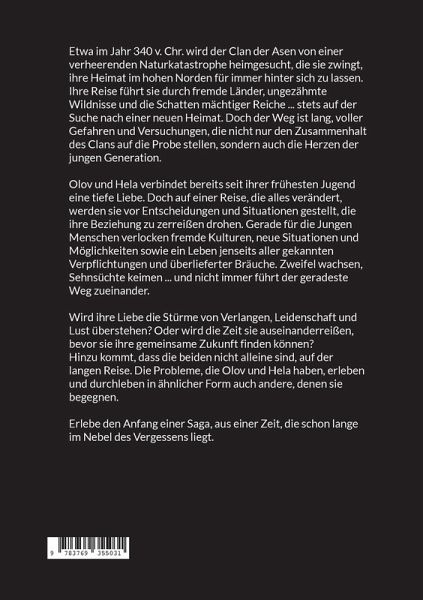 Etwa im Jahr 340 v. Chr. wird der Clan der Asen von einer verheerenden Naturkatastrophe heimgesucht, die sie zwingt, ihre Heimat im hohen Norden für immer hinter sich zu lassen. Ihre Reise führt sie durch fremde Länder, ungezähmte Wildnisse und die Schatten mächtiger Reiche ... stets auf der Suche nach einer neuen Heimat. Doch der Weg ist lang, voller Gefahren und Versuchungen, die nicht nur den Zusammenhalt des Clans auf die Probe stellen, sondern auch die Herzen der jungen Generation. Olov und Hela verbindet bereits seit ihrer frühesten Jugend eine tiefe Liebe. Doch auf einer Reise, die alles verändert, werden sie vor Entscheidungen und Situationen gestellt, die ihre Beziehung zu zerreißen drohen. Gerade für die Jungen Menschen verlocken fremde Kulturen, neue Situationen und Möglichkeiten sowie ein Leben jenseits aller gekannten Verpflichtungen und überlieferter Bräuche. Zweifel wachsen, Sehnsüchte keimen ... und nicht immer führt der geradeste Weg zueinander. Wird ihre Liebe die Stürme von Verlangen, Leidenschaft und Lust überstehen? Oder wird die Zeit sie auseinanderreißen, bevor sie ihre gemeinsame Zukunft finden können? Hinzu kommt, dass die beiden nicht alleine sind, auf der langen Reise. Die Probleme, die Olov und Hela haben, erleben und durchleben in ähnlicher Form auch andere, denen sie begegnen. Erlebe den Anfang einer Saga, aus einer Zeit, die schon lange im Nebel des Vergessens liegt.