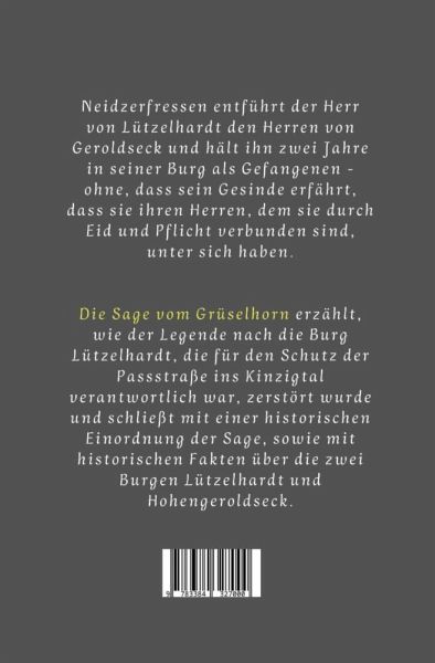 Neidzerfressen entführt der Herr von Lützelhardt den Herren von Geroldseck und hält ihn zwei Jahre in seiner Burg als Gefangenen - ohne, dass sein Gesinde erfährt, dass sie ihren Herren, dem sie durch Eid und Pflicht verbunden sind, unter sich haben. Die Sage vom Grüselhorn erzählt, wie der Legende nach die Burg Lützelhardt, die für den Schutz der Passstraße ins Kinzigtal verantwortlich war, zerstört wurde und schließt mit einer historischen Einordnung der Sage, sowie mit historischen Fakten über die zwei Burgen Lützelhardt und Hohengeroldseck.