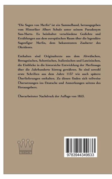 "Die Sagen von Merlin" ist ein Sammelband, herausgegeben vom Historiker Albert Schulz unter seinem Pseudonym San-Marte. Es beinhaltet verschiedene Gedichte und Erzählungen aus dem europäischen Raum über die legendäre Sagenfigur Merlin, dem bekanntesten Zauberer des Okzidents.