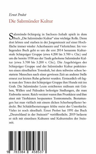 Salzmünde-Schiepzig in Sachsen-Anhalt spielt in dem Buch "Die Salzmünder Kultur" eine wichtige Rolle. Denn dort lebten und starben in der Jungsteinzeit auf einer Hochfläche immer wieder Ackerbauern und Viehzüchter. Im vorliegenden Buch geht es um die erst 2014 benannte Kulturstufe Schiepziger Gruppe (etwa 4.200 bis 3.700 v. Chr.) und um die bereits 1938 aus der Taufe gehobene Salzmünder Kultur (etwa 3.700 bis 3.200 v. Chr.). Die Angehörigen der Schiepziger Gruppe und der Salzmünder Kultur praktizierten einen rätselhaften Totenkult, bei dem teilweise schon bestattete Menschen nach einer gewissen Zeit an anderer Stelle erneut zur letzten Ruhe gebettet wurden. Erstaunlich oft legte man den Toten der Schiepziger Gruppe ihre Hunde mit ins Grab. Die Salzmünder Leute errichteten mühsam mit Gräben, Wällen und Palisaden befestigte Siedlungen, die man Erdwerke nennt. Reich verziert waren ihre Prunkäxte und ihre einst mit Tierhäuten bespannten Tontrommeln. Bestattungen hat man vielfach miteinem dicken Scherbenpflaster bedeckt. Bei Schädelbestattungen fehlte meist der Unterkiefer. Vieles ist noch rätselhaft. Ernst Probst hat 1991 das Buch "Deutschland in der Steinzeit veröffentlicht. 2019 befasste er sich mit einzelnen Kulturen und Kulturstufen der Steinzeit.