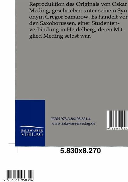 Reproduktion des Originals von Oskar Meding, geschrieben unter seinem Synonym Gregor Samarow. Es handelt von den Saxoborussen, einer Studentenverbindung in Heidelberg, deren Mitglied Meding selbst war.