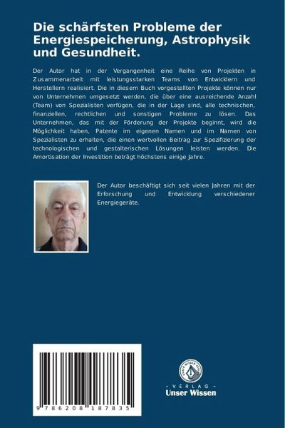 Der Autor hat in der Vergangenheit eine Reihe von Projekten in Zusammenarbeit mit leistungsstarken Teams von Entwicklern und Herstellern realisiert. Die in diesem Buch vorgestellten Projekte können nur von Unternehmen umgesetzt werden, die über eine ausreichende Anzahl (Team) von Spezialisten verfügen, die in der Lage sind, alle technischen, finanziellen, rechtlichen und sonstigen Probleme zu lösen. Das Unternehmen, das mit der Förderung der Projekte beginnt, wird die Möglichkeit haben, Patente im eigenen Namen und im Namen von Spezialisten zu erhalten, die einen wertvollen Beitrag zur Spezifizierung der technologischen und gestalterischen Lösungen leisten werden. Die Amortisation der Investition beträgt höchstens einige Jahre.