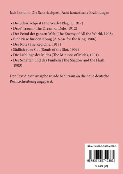 Jack London: Die Scharlachpest. Acht fantastische ErzählungenDie Scharlachpest: »The Scarlet Plague«, 1912.Debs' Traum: »The Dream of Debs«, 1912.Der Feind der ganzen Welt: »The Enemy of All the World«, 1908.Eine Nase für den König: »A Nose for the King«, 1906.Der Rote: »The Red One«, 1918.Südlich vom Slot: »South of the Slot«, 1909.Die Lieblinge des Midas: »The Minions of Midas«, 1901.Der Schatten und das Funkeln: »The Shadow and the Flash«, 1903.Neuausgabe, herausgegeben von Karl-Maria Guth, Berlin 2023.Der Text dieser Ausgabe wurde behutsam an die neue deutsche Rechtschreibung angepasst.Umschlagabbildung: Bearbeiteter Umschlag der Erstausgabe 1912Gesetzt aus der Minion Pro, 11 pt.Die Sammlung Hofenberg erscheint im Verlag Henricus - Edition Deutsche Klassik GmbH, Berlin