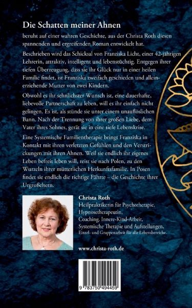 Die Schatten meiner Ahnen - Wie Beziehung gelingen kannDieser spannende Roman beruht auf einer wahren Geschichte. Beschrieben wird das Schicksal von Franziska Licht, der es einfach nicht gelingen will, eine dauerhafte und liebevolle Partnerschaft zu leben. Durch eine Systemische Familientherapie kommt sie in Kontakt mit ihren verletzten Gefühlen und den Verstrickungen mit ihren Ahnen.In Polen findet sie die richtige Fährte, die Geschichte ihrer Urgroßeltern.Ein Buch für alle Menschen, die auf dem Weg zu sich selbst sind und Beziehungen liebevoll und wertschätzend leben möchten.