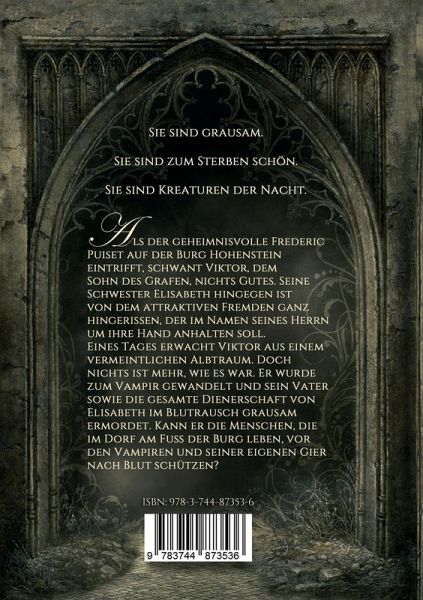 Sie sind grausam. Sie sind zum Sterben schön. Sie sind Kreaturen der Nacht.Als der geheimnisvolle Frederic Puiset auf der Burg Hohenstein eintrifft, schwant Viktor, dem Sohn des Grafen, nichts Gutes. Seine Schwester Elisabeth hingegen ist von dem attraktiven Fremden ganz hingerissen, der im Namen seines Herrn um ihre Hand anhalten soll. Eines Tages erwacht Viktor aus einem vermeintlichen Albtraum. Doch nichts ist mehr, wie es war. Er wurde zum Vampir gewandelt und sein Vater sowie die gesamte Dienerschaft von Elisabeth im Blutrausch grausam ermordet. Kann er die Menschen, die im Dorf am Fuß der Burg leben, vor den Vampiren und seiner eigenen Gier nach Blut schützen?