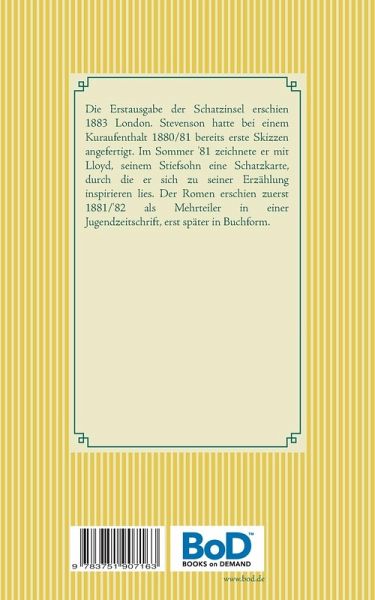 Die Erstausgabe der Schatzinsel erschien 1883 London. Stevenson hatte bei einem Kuraufenthalt 1880/81 bereits erste Skizzen angefertigt. Im Sommer '81 zeichnete er mit Lloyd, seinem Stiefsohn eine Schatzkarte, durch die er sich zu seiner Erzählung inspirieren lies. Der Romen erschien zuerst 1881/'82 als Mehrteiler in einer Jugendzeitschrift, erst später in Buchform.