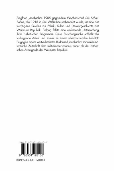 Siegfried Jacobsohns 1905 gegründete Wochenschrift "Die Schaubühne", die 1918 in "Die Weltbühne" umbenannt wurde, ist eine der wichtigsten Quellen zur Politik-, Kultur- und Literaturgeschichte der Weimarer Republik. Bislang fehlte eine umfassende Untersuchung ihres ästhetischen Programms. Diese Forschungslücke schließt die Arbeit und kommt zu einem überraschenden Resultat: Entgegen einem weitverbreiteten Bild stand Jacobsohns radikaldemokratische Zeitschrift dem Kulturkonservatismus näher als der ästhetischen Avantgarde der Weimarer Republik.