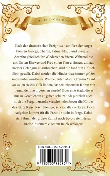 Spannendes Abenteuer- und Fantasybuch1.Abenteuer, 2.TeilACHTUNG: Dieses Buch ist 2017 bereits unter dem Titel"Die Scherben des Schicksals" erschienen. Mit Veröffentlichung des 3. Teils wurde die Buchreihe umbenannt und die Cover geändert.Nach den dramatischen Ereignissen am Pass der Angst können George, Charlie, Fatma, Madu und Sying am Acaraho glücklich ihr Wiedersehen feiern. Während die entführten Ehawee und Fred einen Plan ersinnen, um aus Brelors Gefängnis auszubrechen, sind die fünf nun auf sich allein gestellt. Dabei werden die Hindernisse immer größer und unüberwindbarer. Was bedeuten Madus Träume? Und wo sollen sie ein Volk finden, das seit tausenden Jahren von niemanden mehr gesehen wurde? Oder eine Stadt, die es nur in Geschichten zu geben scheint? Als plötzlich auch noch die Pergamentrolle verschwindet, bevor die Kinder das letzte Rätsel lesen können, scheint alles verloren. Doch Aufgeben kommt für die Freunde nicht in Frage. Dabei steht ihnen der größte Kampf noch bevor: Sie müssen Brelor in seinem eigenem Reich schlagen!