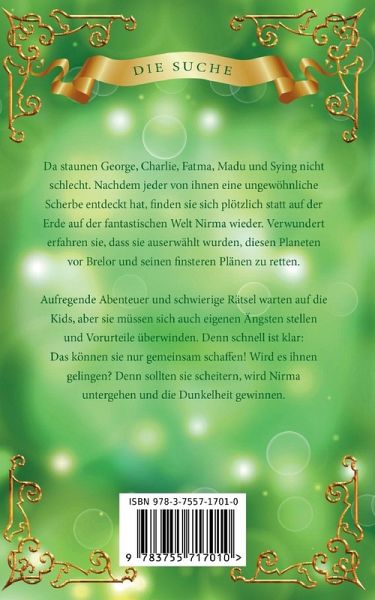 Spannendes Abenteuer- und Fantasybuch1.Abenteuer, 1.TeilAchtung Titel- und Coveränderung: Dieses Buch ist 2017 bereits unter dem Titel "Die Scherben des Schicksals - Die Suche" mit einem anderen Cover erschienen.Der fünfzehnjährige George aus England, die dreizehnjährigen Mädchen Charlie und Fatma aus Amerika und dem Mittleren Osten sowie die elfjährigen Jungen Madu und Sying aus Afrika und China haben in ihren Ländern auf der Erde unter den unterschiedlichsten Schwierigkeiten zu leiden. So kämpfen sie zum Beispiel mit Mobbing, Obdachlosigkeit oder den Problemen als Flüchtling.Als jeder von ihnen eine ungewöhnliche Scherbe findet, ändert sich ihr Leben schlagartig. Auf einmal befinden sie sich auf der fantastischen Welt Nirma, die nur sie vor dem Untergang bewahren können. Schwierige Rätsel und aufregende Abenteuer erwarten sie. Dabei müssen sie lernen als Team zusammenzuarbeiten, Vorurteile zu überwinden und über sich hinauszuwachsen. Allmählich erkennen sie, dass in ihnen allenmehr steckt, als ihnen bewusst war, und dass man Freunde an den ungewöhnlichsten Orten findet, wenn man es nur zulässt.Pressestimmen/Rezensionen:"ein Jugendbuch mit Anspruch, so dass sicher auch ältere Freunde des Genres ihre Freude an diesem Werk finden werden" (RP)"Spannung, Magie und Abenteuer für Jung und Alt""für jeden, der Harry Potter mochte"