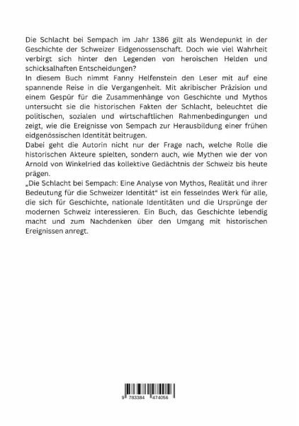 Die Schlacht bei Sempach im Jahr 1386 gilt als Wendepunkt in der Geschichte der Schweizer Eidgenossenschaft. Doch wie viel Wahrheit verbirgt sich hinter den Legenden von heroischen Helden und schicksalhaften Entscheidungen?In diesem Buch nimmt Fanny Helfenstein den Leser mit auf eine spannende Reise in die Vergangenheit. Mit akribischer Präzision und einem Gespür für die Zusammenhänge von Geschichte und Mythos untersucht sie die historischen Fakten der Schlacht, beleuchtet die politischen, sozialen und wirtschaftlichen Rahmenbedingungen und zeigt, wie die Ereignisse von Sempach zur Herausbildung einer frühen eidgenössischen Identität bei-trugen.Dabei geht die Autorin nicht nur der Frage nach, welche Rolle die historischen Akteure spielten, sondern auch, wie Mythen wie der von Arnold von Winkelried das kollektive Gedächtnis der Schweiz bis heute prägen."Die Schlacht bei Sempach: Eine Analyse von Mythos, Realität und ihrer Bedeutung für die Schweizer Identität" ist ein fesselndes Werk für alle, die sich für Geschichte, nationale Identitäten und die Ursprünge der modernen Schweiz interessieren. Ein Buch, das Ge-schichte lebendig macht und zum Nachdenken über den Umgang mit historischen Ereignissen anregt.