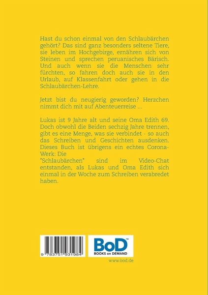 Hast du schon einmal von den Schlaubärchen gehört? Das sind ganz besonders seltene Tiere, sie leben im Hochgebirge, ernähren sich von Steinen und sprechen peruanisches Bärisch. Und auch wenn sie die Menschen sehr fürchten, so fahren doch auch sie in den Urlaub, auf Klassenfahrt oder gehen in die Schlaubärchen-Lehre. Jetzt bist du neugierig geworden? Herzchen nimmt dich mit auf Abenteuerreise ...Lukas ist 9 Jahre alt und seine Oma Edith 69. Doch obwohl die Beiden sechzig Jahre trennen, gibt es eine Menge, was sie verbindet - so auch das Schreiben und Geschichten ausdenken. Dieses Buch ist übrigens ein echtes Corona-Werk: Die "Schlaubärchen" sind im Video-Chat entstanden, als Lukas und Oma Edith sich einmal in der Woche zum Schreiben verabredet haben.