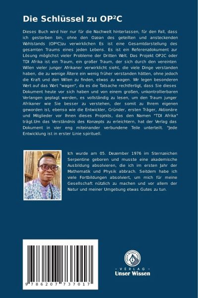 Dieses Buch wird hier nur für die Nachwelt hinterlassen, für den Fall, dass ich gestorben bin, ohne den Ozean des geteilten und ansteckenden Wohlstands (OP²C)zu verwirklichen Es ist eine Gesamtdarstellung des gesamten Traums eines jeden Lebens. Es ist ein Referenzdokument zur Lösung möglichst vieler Probleme der Dritten Welt. Das Projekt OP2C oder TDI Afrika ist ein Traum, ein großer Traum, der sich durch den vereinten Willen vieler junger Afrikaner verwirklicht sieht, die viele Dinge verstanden haben, die zu wenige Ältere ein wenig früher verstanden hätten, ohne jedoch die Kraft und den Willen zu finden, etwas zu wagen. Wir legen besonderen Wert auf das Wort "wagen", da es die Tatsache rechtfertigt, dass Sie dieses Dokument heute vor sich haben und von einem großen, unkontrollierbaren Verlangen geplagt werden, es vollständig zu lesen, um den Traum junger Afrikaner wie Sie besser zu verstehen, der somit zu Ihrem eigenen geworden ist, ebenso wie die Entwickler, Gründer, ersten Träger, Aktionäre und Mitglieder vor Ihnen dieses Projekts, das den Namen "TDI Afrika" trägt.Um das Verständnis des Konzepts zu erleichtern, hat der Verlag das Dokument in vier eng miteinander verbundene Teile unterteilt. "Jede Entwicklung ist in erster Linie spirituell.