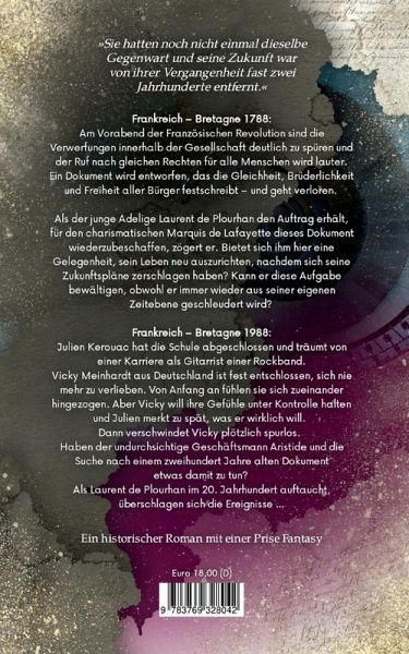 »Sie hatten noch nicht einmal dieselbe Gegenwart und seine Zukunft war von ihrer Vergangenheit fast zwei Jahrhunderte entfernt« Frankreich, Bretagne 1788: Am Vorabend der Französischen Revolution sind die Verwerfungen innerhalb der Gesellschaft deutlich zu spüren und der Ruf nach gleichen Rechten für alle Menschen wird lauter. Ein Dokument wird entworfen, das die Gleichheit, Brüderlichkeit und Freiheit aller Bürger festschreibt, und geht verloren. Als der junge Adelige Laurent de Plourhan den Auftrag erhält, für den charismatischen Marquis de Lafayette dieses Dokument wiederzubeschaffen, zögert er. Bietet sich ihm hier eine Gelegenheit, sein Leben neu auszurichten, nachdem sich seine Zukunftspläne zerschlagen haben? Kann er diese Aufgabe bewältigen, obwohl er immer wieder aus seiner eigenen Zeitebene geschleudert wird? Frankreich, Bretagne 1988: Julien Kerouac hat die Schule abgeschlossen und träumt von einer Karriere als Gitarrist einer Rockband. Vicky Meinhardt aus Deutschland ist fest entschlossen, sich nie mehr zu verlieben. Von Anfang an fühlen sie sich zueinander hingezogen. Aber Vicky will ihre Gefühle unter Kontrolle halten und Julien merkt zu spät, was er wirklich will. Dann verschwindet Vicky plötzlich spurlos. Haben der undurchsichtige Geschäftsmann Aristide und die Suche nach einem zweihundert Jahre alten Dokument etwas damit zu tun? Als Laurent de Plourhan im 20. Jahrhundert auftaucht, überschlagen sich die Ereignisse. Ein historischer Roman mit einer Prise Fantasy