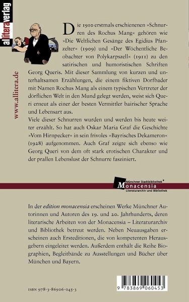 Die 1910 erstmals erschienenen »Schnurren des Rochus Mang« gehören wie »Die Weltlichen Gesänge des Egidius Pfanzelter« (1909) und »Der Wöchentliche Beobachter von Polykarpszell« (1911) zu den satirischen und humoristischen Schriften Georg Queris. Mit dieser Sammlung von kurzen und unterhaltsamen Erzählungen, die einem fiktiven Dorfbader mit Namen Rochus Mang als einem typischen Vertreter der dörflichen Welt in den Mund gelegt werden, weist sich Queri erneut als einer der besten Vermittler bairischer Sprache und Lebensart aus.
