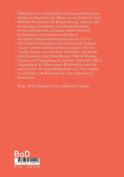 Während ihres Aufenthaltes in Braunschweig lernte Maria von Branconi, die Mätresse von Erbprinz Carl Wilhelm Ferdinand von Braunschweig, mehrere der am dortigen Collegium Carolinum lehrenden Professoren kennen, darunter Johann Joachim Eschenburg und Johann Arnold Ebert. Auf einer Schweizreise lernte sie 1779 in Zürich den Philosophen und Schriftsteller Johann Caspar Lavater und darauf in Lausanne J. W. von Goethe kennen. Dieser war von ihrer Schönheit und ihrem Geist fasziniert. Auf ihren Besuch 1780 in Weimar folgten zwei Gegenbesuche Goethes 1783 und 1784 in Langenstein. Er führte einen Briefwechsel mit ihr und schickte ihr Manuskripte seiner Werke, Goethe bezeichnete Maria von Branconi gerne als die schöne Frau. Hrsg.: Hans-Jürgen Sträter, Adlerstein Verlagsie als