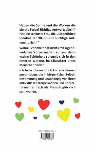 Haben die Sonne und die Wolken die gleiche Farbe? Richtige Antwort: "Nein!" Hat die schönste Frau die "körperlichen Idealmaße" 90-60-90? Richtige Antwort: "Nein!"Wahre Schönheit hat nichts mit irgendwelchen Körpermaßen zu tun, denn wahre Schönheit spiegelt sich in den inneren Werten, im Charakter eines Menschen wider.Ich habe dieses Buch für alle Frauen geschrieben, die in körperlicher Selbstbestimmung und unabhängig von ihren individuellen Körpermaßen und Körperformen einfach als Mensch glücklich sein wollen.