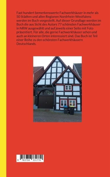 Fast hundert bemerkenswerte Fachwerkhäuser in mehr als 50 Städten und allen Regionen Nordrhein-Westfalens werden im Buch vorgestellt. Auf dieser Grundlage werden im Buch die aus Sicht des Autors 77 schönsten Fachwerkhäuser in NRW ausgewählt und auf jeweils einer Seite mit Foto präsentiert. Für alle, die gerne Fachwerkhäuser sehen und auch an kleineren Orten interessiert sind. Das Buch ist Teil einer Reihe zu den schönsten Fachwerkhäusern Deutschlands.