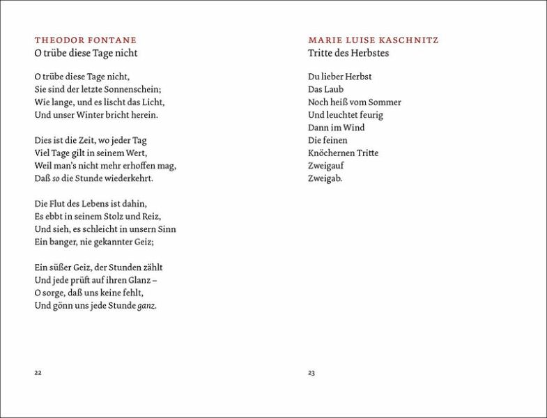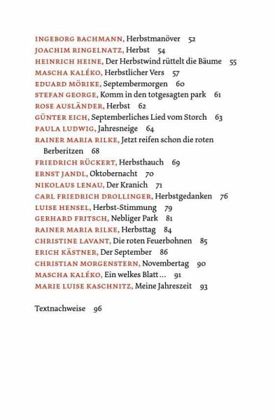 Erich Kästner: Herbst auf der ganzen Linie Else Lasker-Schüler: Herbst Barthold Hinrich Brockes: Gedanken bei dem Fall der Blätter im Herbst Ricarda Huch: Herbst Kurt Tucholsky: Schöner Herbst Sarah Kirsch: Laute Musik Sarah Kirsch: Der September Theodor Fontane: O trübe diese Tage nicht Marie Luise Kaschnitz: Tritte des Herbstes Friedrich Hebbel: Herbstbild Rainer Maria Rilke: Spätherbst in Venedig Catharina Regina von Greiffenberg: Auf die fruchtbringende Herbstzeit Rainer Malkowski: Schöne seltene Weide Hermann Hesse: Verfrühter Herbst Theodor Kramer: An einem schönen Herbsttag Annette von Droste-Hülshoff: Herbst Peter Huchel: Kinder im Herbst August von Platen: An eine Geißblattranke Christine Busta: Die Korbflechterin an den Herbst Erich Kästner: Exemplarische Herbstnacht Friedrich Hölderlin: Hälfte des Lebens Hilde Domin: Herbstaugen Anonym: Ein alt Totenlied Emanuel Geibel: Ich sah den Wald sich färben Ingeborg Bachmann: Herbstmanöver Joachim Ringelnatz: Herbst Heinrich Heine: Der Herbstwind rüttelt die Bäume Mascha Kaléko: Herbstlicher Vers Eduard Mörike: Septembermorgen Stefan George: Komm in den totgesagten park Rose Ausländer: Herbst Günter Eich: Septemberliches Lied vom Storch Paula Ludwig: Jahresneige Rainer Maria Rilke: Jetzt reifen schon die roten Berberitzen Friedrich Rückert: Herbsthauch Ernst Jandl: Oktobernacht Nikolaus Lenau: Der Kranich Carl Friedrich Drollinger: Herbstgedanken Luise Hensel: Herbst-Stimmung Gerhard Fritsch: Nebliger Park Rainer Maria Rilke: Herbsttag Christine Lavant: Die roten Feuerbohnen Erich Kästner: Der September Christian Morgenstern: Novembertag Mascha Kaléko: Ein welkes Blatt... Marie Luise Kaschnitz: Meine Jahreszeit