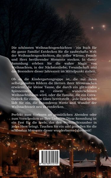 Die schönsten Weihnachtsgeschichten - ein Buch für die ganze Familie! Entdecken Sie die zauberhafte Welt der Weihnachtsgeschichten, die voller Wärme, Freude und Herz berührender Momente stecken. In dieser Sammlung erleben Sie die wahre Magie von Weihnachten, in der Nächstenliebe, Freundschaft und das Besondere dieser Jahreszeit im Mittelpunkt stehen. Ob es die Kindergartengruppe ist, die mit ihren selbstgemalten Bildern die Herzen ihrer Mitmenschen erwärmt, die kleine Tanne, die durch ein glitzerndes Spinnennetz zu einem wunderschönen Weihnachtsbaum wird, oder die Familie, die ein Extra-Gedeck für einsame Gäste bereitstellt - jede Geschichte lädt Sie ein, die besonderen Werte und Wunder der Weihnachtszeit neu zu entdecken. Lassen Sie sich von lustigen, spannenden und bewegenden Erzählungen verzaubern, die nicht nur Kinder, sondern auch Erwachsene in eine festliche Stimmung versetzen. Diese Geschichten erinnern uns daran, dass Weihnachten nicht nur ein Fest ist, sondern ein Gefühl - ein Gefühl von Nähe, Zusammenhalt und der Freude, anderen ein Lächeln zu schenken. Perfekt zum Vorlesen an gemütlichen Abenden oder zum Verschenken an Ihre Liebsten: Diese Sammlung ist ein Fest für die Seele, das den Weihnachtszauber in jedes Herz bringt. Tauchen Sie ein und genießen Sie die schönsten Momente dieser wunderbaren Jahreszeit!