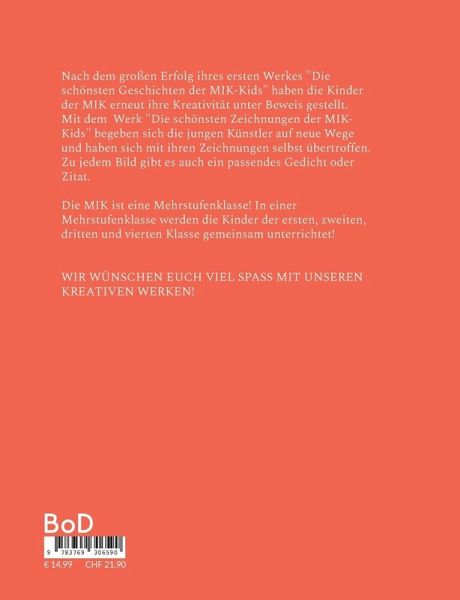 Nach dem großen Erfolg ihres Werkes DIE SCHOENSTEN GESCHICHTEN DER MIK-KIDS haben die Kinder der MIK erneut ihre Kreativität unter Beweis gestellt. Mit dem Werk DIE SCHOENSTEN ZEICHNUNGEN DER MIK-KIDS begeben sich die jungen Künstler auf neue Wege und haben sich mit ihren Zeichnungen selbst übertroffen. Zu jedem Bild gibt es auch ein passendes Gedicht oder Zitat. Auf den nächsten Seiten nehmen wir Euch mit auf eine kreative Reise. Der interessierte Kunstfreund findet neben abstrakten, fantasievollen, naturalistischen Zeichnungen auch selbst die Möglichkeit, sich kreativ zu betätigen. Das Tolle beim kreativ sein: Es gibt kein Richtig und kein Falsch. Kreativität ist nicht messbar. Wir Kinder der MIK wünschen Euch viel Spaß.