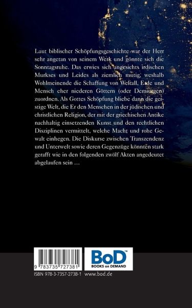 Laut biblischer Schöpfungsgeschichte war der Herr sehr angetan von seinem Werk und gönnte sich die Sonntagsruhe. Das erwies sich angesichts irdischen Murkses und Leides als ziemlich mutig, weshalb Wohlmeinende die Schaffung von Weltall, Erde und Mensch eher niederen Göttern (oder Demiurgen) zuordnen. Als Gottes Schöpfung bliebe dann die geistige Welt, die Er den Menschen in der jüdischen und christlichen Religion, der mit der griechischen Antike nachhaltig einsetzenden Kunst und den rechtlichen Disziplinen vermittelt, welche Macht und rohe Gewalt einhegen. Die Diskurse zwischen Transzendenz und Unterwelt sowie deren Gegenzüge könnten stark gerafft wie in den folgenden zwölf Akten angedeutet abgelaufen sein ...