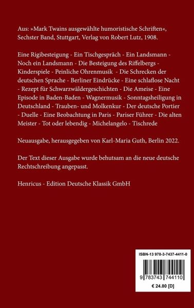 Mark Twain: Die Schrecken der deutschen Sprache. Ausgewählte humoristische Reisebilder aus EuropaInhaltsverzeichnis:Reisebilder.Eine Rigibesteigung.Ein Tischgespräch.Ein Landsmann.Noch ein Landsmann.Die Besteigung des Riffelbergs.Kinderspiele.Peinliche Ohrenmusik.Die Schrecken der deutschen Sprache.Berliner Eindrücke.Eine schlaflose Nacht.Rezept für Schwarzwäldergeschichten.Die Ameise.Eine Episode in Baden-Baden.Wagnermusik.Sonntagsheiligung in Deutschland.Trauben- und Molkenkur.Der deutsche Portier.Duelle.Eine Beobachtung in Paris.Pariser Führer.Die alten Meister.Tot oder lebendig.Michelangelo.Tischrede.Neuausgabe, herausgegeben von Karl-Maria Guth, Berlin 2023.Der Text dieser Ausgabe wurde behutsam an die neue deutsche Rechtschreibung angepasst.Umschlagabbildung: Julius Jacob d. J.: Wilhelmplatz, altes Berlin, 1886Gesetzt aus der Minion Pro, 11 pt.Die Sammlung Hofenberg erscheint im Verlag Henricus - Edition Deutsche Klassik GmbH, Berlin