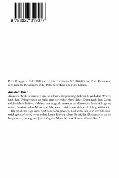 Peter Rosegger (1843-1918) war ein österreichischer Schriftsteller und Poet. Er verwendete auch die Pseudonyme P. K., Petri Kettenfeier und Hans Malser. Aus dem Buch: "In meiner Seele ist zuweilen eine so seltsame Empfindung; Sehnsucht nach dem Weiten, nach dem Unbegrenzten ist nicht ganz der rechte Name dafür; Durst nach dem Lichte möchte ich sie heißen. - Mein armes Auge, du vermagst der dürstenden Seele nicht genug zu tun; du wirst in dem Meere des Lichtes noch ertrinken und sie wird nicht gesättigt sein. Ich bin dieser Tage wieder auf dem Zahn gewesen. Bald werde ich ja an den Glockenstrick geknüpft sein, wenn andere Leute Feiertag haben. Es sei, der Glockenstrick ist ein langer Atem, der sagt mit jedem Zug den Menschen was Gutes und lobet Gott."