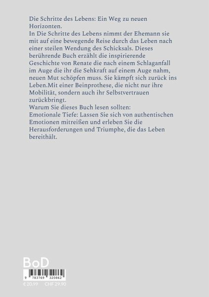 Die Schritte des Lebens: Ein Weg zu neuen Horizonten. In Die Schritte des Lebens nimmt der Ehemann sie mit auf eine bewegende Reise durch das Leben nach einer steilen Wendung des Schicksals. Dieses berührende Buch erzählt die inspirierende Geschichte von Renate die nach einem Schlaganfall im Auge die ihr die Sehkraft auf einem Auge nahm, neuen Mut schöpfen muss. Sie kämpft sich zurück ins Leben. Mit einer Beinprothese, die nicht nur ihre Mobilität, sondern auch ihr Selbstvertrauen zurückbringt. Warum Sie dieses Buch lesen sollten: Emotionale Tiefe: Lassen Sie sich von authentischen Emotionen mitreißen und erleben Sie die Herausforderungen und Triumphe, die das Leben bereithält.