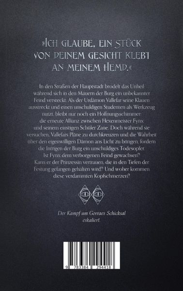 »Ich glaube, ein Stück von deinem Gesicht klebt an meinem Hemd.«In den Straßen der Hauptstadt brodelt das Unheil während sich in den Mauern der Burg ein unbekannter Feind versteckt. Als der Urdämon Vallefar seine Klauen ausstreckt und einen unschuldigen Studenten als Werkzeug nutzt, bleibt nur noch ein Hoffnungsschimmer: die erneute Allianz zwischen Hexenmeister Fynx und seinem einstigen Schüler Zane. Doch während sie versuchen, Vallefars Pläne zu durchkreuzen und die Wahrheit über den eigenwilligen Dämon ans Licht zu bringen, fordern die Intrigen der Burg ein unschuldiges Todesopfer. Ist Fynx dem verborgenen Feind gewachsen? Kann er der Prinzessin vertrauen, die in den Tiefen der Festung gefangen gehalten wird? Und woher kommen diese verdammten Kopfschmerzen? Der Kampf um Gorraes Schicksal eskaliert.