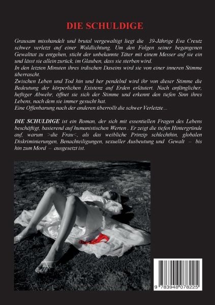 Grausam misshandelt und brutal vergewaltigt, liegt die 39-Jährige Eva Creutz schwer verletzt auf einer Waldlichtung. Um den Folgen seiner begangenen Gewalttat zu entgehen, sticht der unbekannte Täter mit einem Messer auf sie ein und lässt sie allein zurück, in dem Glauben, dass sie sterben wird. In den letzten Minuten ihres irdischen Daseins wird sie von einer inneren Stimme überrascht. Zwischen Leben und Tod hin und her pendelnd wird ihr von dieser Stimme die Bedeutung der körperlichen Existenz auf Erden erläutert. Nach anfänglicher, heftiger Abwehr, öffnet sie sich der Stimme und erkennt den tieferen Sinn ihres Lebens, nach dem sie immer gesucht hat. Eine Offenbarung nach der anderen überrollt sie... DIE SCHULDIGE ist ein Roman, der sich mit essentiellen Fragen des Lebens beschäftigt, basierend auf humanistischen Werten. Er zeigt die tiefen Hintergründe auf, warum >ie Frau<, als Vertreterin des weiblichen Prinzips schlechthin, globalen Diskriminierungen, Benachteiligungen, sexueller Ausbeutung und Gewalt - bis hin zum Mord - ausgesetzt ist.