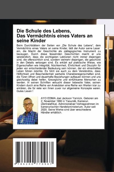 Beim Durchblättern der Seiten von "Die Schule des Lebens", dem Vermächtnis eines Vaters an seine Kinder, lädt der Autor seine Leser ein, die Macht der Geschichte als pädagogisches Instrument zu bezeugen. Durch diese fesselnden Geschichten macht er uns verständlich, dass die wichtigsten Lektionen nicht immer diejenigen sind, die offensichtlich sind, sondern vielmehr diejenigen, die geschickt in den Details verborgen sind. Es erklärt auf praktische Weise, wie Eigenschaften wie Integrität, Nüchternheit, Ehrlichkeit und Disziplin für jeden von entscheidender Bedeutung sein können, der ein ehrenhaftes Leben führen möchte. Es führt sie auch zu dem Verständnis, dass Höflichkeit und Bescheidenheit wertvolle Charaktereigenschaften sind, die Türen öffnen und dauerhafte Beziehungen aufbauen können und uns gleichzeitig dabei helfen, fürsorgliche und einfühlsame Menschen zu werden. In seinen Schriften versucht dieser liebevolle Vater, seinen Kindern durch eine Reihe von Anekdoten eine Reihe von Werten klar zu erklären, die für viele von ihnen zuvor nur allgemeine Konzepte waren. Gutes Lesen !