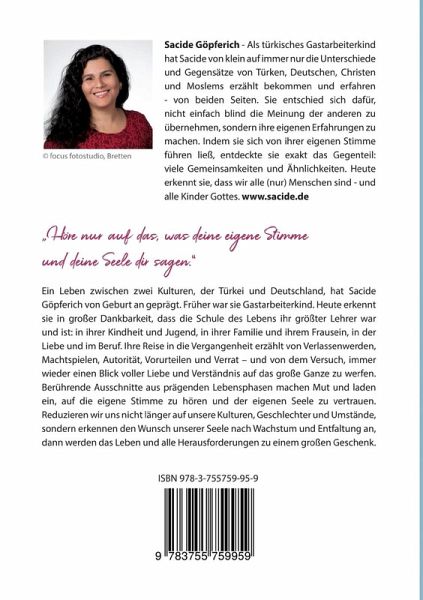 Höre nur auf das, was deine eigene Stimme und deine Seele dir sagen. Ein Leben zwischen zwei Kulturen, der Türkei und Deutschland, hat Sacide Göpferich von Geburt an geprägt. Früher war sie Gastarbeiterkind. Heute erkennt sie in großer Dankbarkeit, dass die Schule des Lebens ihr größter Lehrer war und ist: in ihrer Kindheit und Jugend, in ihrer Familie und ihrem Frausein, in der Liebe und im Beruf. Ihre Reise in die Vergangenheit erzählt von Verlassenwerden, Machtspielen, Autorität, Vorurteilen und Verrat und von dem Versuch, immer wieder einen Blick voller Liebe und Verständnis auf das große Ganze zu werfen. Berührende Ausschnitte aus prägenden Lebensphasen machen Mut und laden ein, auf die eigene Stimme zu hören und der eigenen Seele zu vertrauen. Reduzieren wir uns nicht länger auf unsere Kulturen, Geschlechter und Umstände, sondern erkennen den Wunsch unserer Seele nach Wachstum und Entfaltung an, dann werden das Leben und alle Herausforderungen zu einem großen Geschenk.