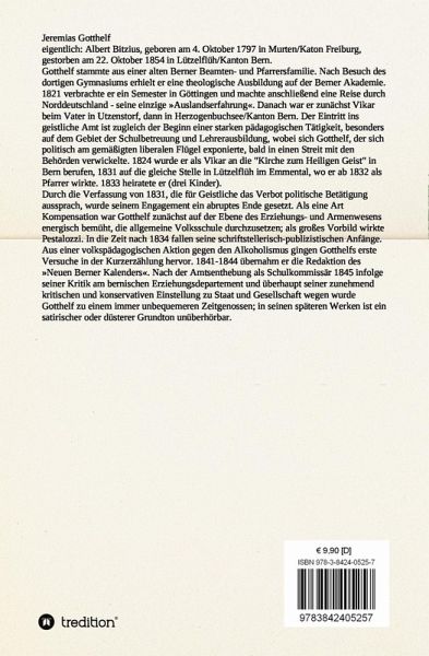 Jeremias Gotthelf (d.i. Albert Bitzius), 4.10.1797 Murten, Kanton Fribourg - 22.10.1854 Lützelflüh, Kanton Bern stammte aus einem Pfarrhaus, besuchte das Gymnasium in Bern (1812-14) und studierte anschließend bis 1820 Theologie an der Berner Akademie. Er unterbrach seine Vikariatszeit bei seinem Vater in Utzenstorf, Oberaargau, durch einen Studienaufenthalt in Göttingen und eine Reise durch den Norden Deutschlands (1821-22). Danach war er wieder Vikar in Utzenstorf; nach dem Tod seines Vaters wurde er 1824 nach Herzogenbuchsee, 1829 nach Bern und 1831 nach Lützelflüh im Emmental versetzt; hier erhielt er 1832 eine Pfarrstelle. Sein politisches Engagement für den Liberalismus fand mit der Verfassung von 1831 ein Ende; sie verbot Geistlichen die politische Betätigung. Stattdessen trat er in der Nachfolge J. H. Pestalozzis und der Schweizer Volksaufklärung für die Verbesserung des Erziehungswesens und der sozialen Verhältnisse ein; seine Kritik an der Berner Erziehungspolitik trug ih