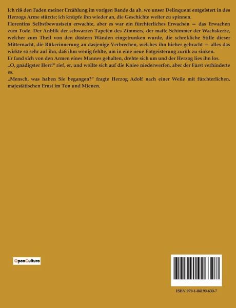 Ich riß den Faden meiner Erzählung im vorigen Bande da ab, wo unser Delinquent entgeistert in des Herzogs Arme stürzte; ich knüpfe ihn wieder an, die Geschichte weiter zu spinnen. Florentins Selbstbewustsein erwachte, aber es war ein fürchterliches Erwachen ¿ das Erwachen zum Tode. Der Anblik der schwarzen Tapeten des Zimmers, der matte Schimmer der Wachskerze, welcher zum Theil von den düstern Wänden eingetrunken wurde, die schrekliche Stille dieser Mitternacht, die Rükerinnerung an dasjenige Verbrechen, welches ihn hieher gebracht ¿ alles das wirkte so sehr auf ihn, daß ihm wenig fehlte, um in eine neue Entgeisterung zurük zu sinken. Er fand sich von den Armen eines Mannes gehalten, drehte sich um und der Herzog lies ihn los. ¿O, gnädigster Herr!¿ rief, er, und wollte sich auf die Kniee niederwerfen, aber der Fürst verhinderte es. ¿Mensch, was haben Sie begangen?¿ fragte Herzog Adolf nach einer Weile mit fürchterlichen, majestätischen Ernst im Ton und Mienen.