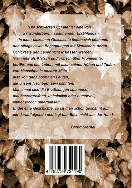 "Die schwarzen Schafe" ist eine von 27 wunderbaren, spannenden Erzählungen. In jeder einzelnen Geschichte finden sich Momente des Alltags sowie Begegnungen mit Menschen, deren Schicksale den Leser nicht loslassen werden. Viel mehr als Klatsch und Tratsch über Prominente, berührt uns das Leben, mit allen seinen Höhen und Tiefen, von Menschen in unserer Mitte, also von ganz normalen Leuten, die unsere Nachbarn sein könnten.Manchmal sind die Erzählungen spannend, mal herzergreifend, unheimlich oder humorvoll, immer jedoch unterhaltsam. Endet eine Geschichte, so ist man schon gespannt auf die darauffolgende und legt das Buch nicht aus der Hand. Bernd Sternal