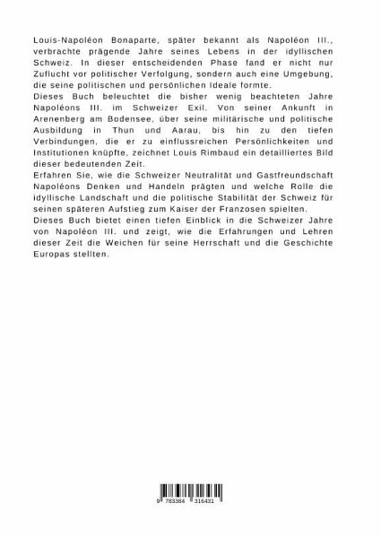 Louis-Napoléon Bonaparte, später bekannt als Napoléon III., verbrachte prägende Jahre seines Lebens in der idyllischen Schweiz. In dieser entscheidenden Phase fand er nicht nur Zuflucht vor politischer Verfolgung, sondern auch eine Umgebung, die seine politischen und persönlichen Ideale formte.Dieses Buch beleuchtet die bisher wenig beachteten Jahre Napoléons III. im Schweizer Exil. Von seiner Ankunft in Arenenberg am Bodensee, über seine militärische und politische Ausbildung in Thun und Aarau, bis hin zu den tiefen Verbindungen, die er zu einflussreichen Persönlichkeiten und Institutionen knüpfte, zeichnet Louis Rimbaud ein detailliertes Bild dieser bedeutenden Zeit.Erfahren Sie, wie die Schweizer Neutralität und Gastfreundschaft Napoléons Denken und Handeln prägten und welche Rolle die idyllische Landschaft und die politische Stabilität der Schweiz für seinen späteren Aufstieg zum Kaiser der Franzosen spielten.Dieses Buch bietet einen tiefen Einblick in die Schweizer Jahre vonNapoléon III. und zeigt, wie die Erfahrungen und Lehren dieser Zeit die Weichen für seine Herrschaft und die Geschichte Europas stellten.