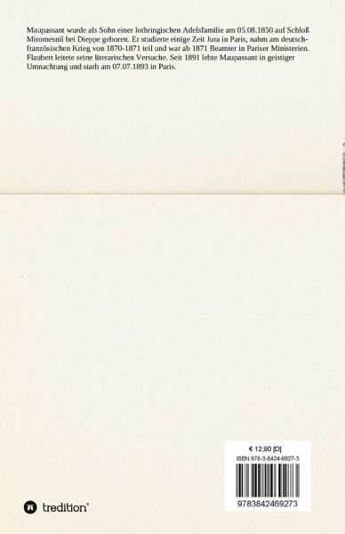 Maupassant wurde als Sohn einer lothringischen Adelsfamilie am 05.08.1850 auf Schloß Miromesnil bei Dieppe geboren. Er studierte einige Zeit Jura in Paris, nahm am deutsch-französischen Krieg von 1870-1871 teil und war ab 1871 Beamter in Pariser Ministerien. Flaubert leitete seine literarischen Versuche. Seit 1891 lebte Maupassant in geistiger Umnachtung und starb am 07.07.1893 in Paris.