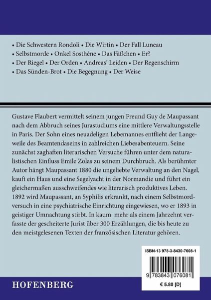 Guy de Maupassant: Die Schwestern Rondoli und andere Novellen Die Schwestern Rondoli ¿ Die Wirtin ¿ Der Fall Luneau ¿ Selbstmorde ¿ Onkel Sosthène ¿ Das Fäßchen ¿ Er? ¿ Der Riegel ¿ Der Orden ¿ Andreas' Leiden ¿ Der Regenschirm ¿ Das Sünden-Brot ¿ Die Begegnung ¿ Der Weise Herausgegeben von Karl-Maria Guth. Berlin 2015. Umschlaggestaltung von Thomas Schultz-Overhage unter Verwendung des Bildes: »Guy« von Tim Tempelhofer, 2015. Gesetzt aus Minion Pro, 11 pt.