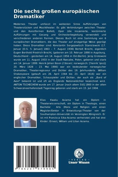 Modernes Theater umfasst im weitesten Sinne Aufführungen von Theaterstücken und Musiktheater. Es gibt Verbindungen zwischen Theater und den Kunstformen Ballett, Oper (die inszenierte, kostümierte Aufführungen mit Gesang und Orchesterbegleitung verwendet) und verschiedenen anderen Formen. Dieses Buch ist eine Sammlung von 6 europäischen Dramatikern, die das Theater auf einzigartige Weise geprägt haben. Diese Dramatiker sind: Konstantin Sergejewitsch Stanislawski (17. Januar [O.S. 5. Januar] 1863 - 7. August 1938) Bertolt Brecht, eigentlich Eugen Berthold Friedrich Brecht, (geboren am 10. Februar 1898 in Augsburg, Deutschland - gestorben am 14. August 1956 in Ost-Berlin). Jerzy Grotowski wurde am 11. August 1933 in der Stadt Rzeszów, Polen, geboren und starb am 14. Januar 1999. Henrik Johan Ibsen (/ bs n/; norwegisch: [ henrik ipsn ]; 20. März 1828 - 23. Mai 1906) war ein bedeutender norwegischer Dramatiker, Theaterregisseur und Dichter des 19. Jahrhunderts. William Shakespeare (getauft am 26. April 1564 bis 23. April 1616) war ein englischer Dramatiker, Schauspieler und Dichter, der auch als "Bard of Avon" bekannt ist und oft als Englands Nationaldichter bezeichnet wird. ANTON TSCHECHOW wurde am 17. Januar [nach altem Stil] 1860 in der alten Schwarzmeerhafenstadt Taganrog geboren und starb am 15. Juli 1904.