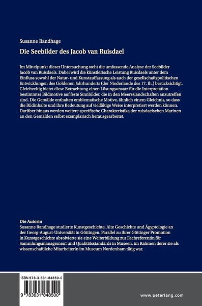 Im Mittelpunkt dieser Untersuchung steht die umfassende Analyse der Seebilder Jacob van Ruisdaels. Dabei wird die künstlerische Leistung Ruisdaels unter dem Einfluss sowohl der Natur- und Kunstauffassung als auch der gesellschaftspolitischen Entwicklungen des Goldenen Jahrhunderts (der Niederlande des 17. Jh.) berücksichtigt. Gleichzeitig bietet diese Betrachtung einen Lösungsansatz für die Interpretation bestimmter Bildmotive auf feste Sinnbilder, die in den Meereslandschaften anzutreffen sind. Die Gemälde enthalten emblematische Motive, ähnlich einem Gleichnis, so dass die Bildinhalte und ihre Bedeutung auf vielfältige Weise interpretiert werden können. Darüber hinaus werden weitere spezifische Charakteristika der ruisdaelschen Marinen an den Gemälden selbst exemplarisch herausgearbeitet.