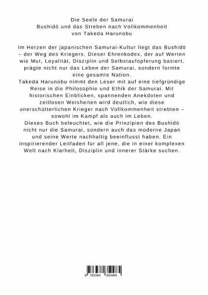 Im Herzen der japanischen Samurai-Kultur liegt das Bushid - der Weg des Kriegers. Dieser Ehrenkodex, der auf Werten wie Mut, Loyalität, Disziplin und Selbstaufopferung basiert, prägte nicht nur das Leben der Samurai, sondern formte eine gesamte Nation.Takeda Harunobu nimmt den Leser mit auf eine tiefgründige Reise in die Philosophie und Ethik der Samurai. Mit historischen Einblicken, spannenden Anekdoten und zeitlosen Weisheiten wird deutlich, wie diese unerschütterlichen Krieger nach Vollkommenheit strebten - sowohl im Kampf als auch im Leben.Dieses Buch beleuchtet, wie die Prinzipien des Bushid nicht nur die Samurai, sondern auch das moderne Japan und seine Werte nachhaltig beeinflusst haben. Ein inspirierender Leitfaden für all jene, die in einer komplexen Welt nach Klarheit, Disziplin und innerer Stärke suchen.