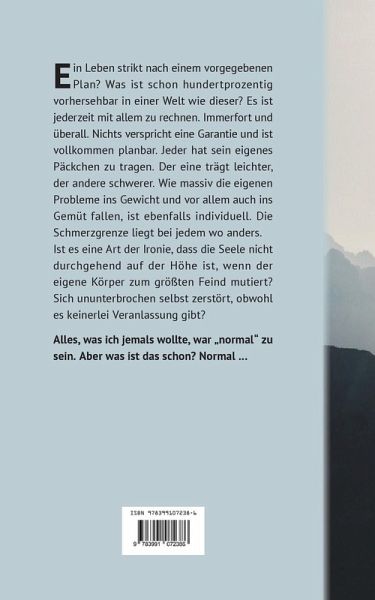 Ein Leben strikt nach einem vorgegebenen Plan? Was ist schon hundertprozentig vorhersehbar in einer Welt wie dieser? Es ist jederzeit mit allem zu rechnen. Immerfort und überall. Nichts verspricht eine Garantie und ist vollkommen planbar. Jeder hat sein eigenes Päckchen zu tragen. Der eine trägt leichter, der andere schwerer. Wie massiv die eigenen Probleme ins Gewicht und vor allem auch ins Gemüt fallen, ist ebenfalls individuell. Die Schmerzgrenze liegt bei jedem wo anders.Ist es eine Art der Ironie, dass die Seele nicht durchgehend auf der Höhe ist, wenn der eigene Körper zum größten Feind mutiert? Sich ununterbrochen selbst zerstört, obwohl es keinerlei Veranlassung gibt? Alles, was ich jemals wollte, war "normal" zu sein. Aber was ist das schon? Normal ...