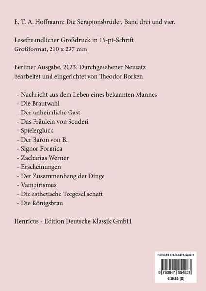 E. T. A. Hoffmann: Die Serapionsbrüder. Band drei und vier der vier BändeLesefreundlicher Großdruck in 16-pt-SchriftGroßformat, 210 x 297 mmBerliner Ausgabe, 2023Durchgesehener Neusatz bearbeitet und eingerichtet von Theodor BorkenInhaltsverzeichnis:Dritter Band.Fünfter Abschnitt.[Nachricht aus dem Leben eines bekannten Mannes].Die Brautwahl.Der unheimliche Gast.Sechster Abschnitt.Das Fräulein von Scuderi.Spielerglück.[Der Baron von B.].Vierter Band.Siebenter Abschnitt.Signor Formica.[Zacharias Werner].Erscheinungen.Achter Abschnitt.Der Zusammenhang der Dinge.[Vampirismus].[Die ästhetische Teegesellschaft].Die Königsbraut.Textgrundlage ist die Ausgabe:E.T.A. Hoffmann: Poetische Werke in sechs Bänden, Band 4, Berlin: Aufbau, 1963.Umschlagabbildung: Ernst Theodor Wilhelm Hoffmann (Deckfarbengemälde eines unbekannten Künstlers, um 1795)Gesetzt aus der Minion Pro, 16 pt.Henricus - Edition Deutsche Klassik GmbHÜber den Autor:1776 in Königsberg auf die Vornamen Ernst Theodor Wilhelm getauft, nennt er sich später aus Verehrung für Mozart Ernst Theodor Amadeus oder kurz E.T.A. Hoffmann. Er studiert Jura in Königsberg, wird Referendar am Berliner Kammergericht, wegen Karikaturen auf preußische Offiziere strafversetzt nach Polen und schließlich Kapellmeister in Bamberg. Bis er 1814 nach Berlin zurückkehrt, widmet er sein künstlerisches Schaffen vornehmlich der Musik. Er wird zum Kammergerichtsrat berufen, gründet den »Serapinenorden« und schreibt seine großen Romane, »Die Elixiere des Teufels« und die »Lebensansichten des Katers Murr«, sowie zahlreiche Erzählungen, deren vorletzte, der »Meister Floh«, beschlagnahmt wird, weil der preußische Polizeidirektor in der Figur des Knarrpanti eine Satire auf seine Person sieht. 1822 erkrankt E.T.A. Hoffmann schwer und diktiert - völlig gelähmt - vom Sterbebett aus die Erzählung »Des Vetters Eckfenster«, in der der große Romantiker sich dem kritischen Realismus annähert, bevor er am 25. Juni in Berlin stirbt.