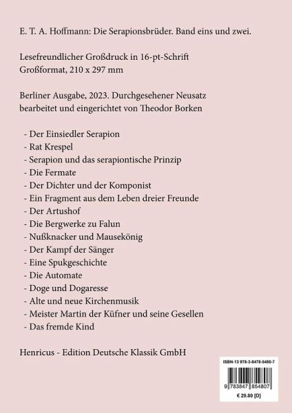 E. T. A. Hoffmann: Die Serapionsbrüder. Band eins und zwei der vier BändeLesefreundlicher Großdruck in 16-pt-SchriftGroßformat, 210 x 297 mmBerliner Ausgabe, 2023Durchgesehener Neusatz bearbeitet und eingerichtet von Theodor BorkenInhaltsverzeichnis:Vorwort.Erster Band.Erster Abschnitt.[Der Einsiedler Serapion].[Rat Krespel].[Serapion und das serapiontische Prinzip].Die Fermate.Der Dichter und der Komponist.Zweiter Abschnitt.Ein Fragment aus dem Leben dreier Freunde.Der Artushof.Die Bergwerke zu Falun.Nußknacker und Mausekönig.Zweiter Band.Dritter Abschnitt.Der Kampf der Sänger.[Eine Spukgeschichte].Die Automate.Doge und Dogaresse.Vierter Abschnitt.[Alte und neue Kirchenmusik].Meister Martin der Küfner und seine Gesellen.Das fremde Kind.Textgrundlage sind die Ausgaben:E.T.A. Hoffmann: Poetische Werke in sechs Bänden, Band 3, Berlin: Aufbau, 1963.E.T.A. Hoffmann: Poetische Werke in sechs Bänden, Band 4, Berlin: Aufbau, 1963.Umschlagabbildung: Ernst Theodor Wilhelm Hoffmann (Deckfarbengemälde eines unbekannten Künstlers, um 1795)Gesetzt aus der Minion Pro, 16 pt.Henricus - Edition Deutsche Klassik GmbHÜber den Autor:1776 in Königsberg auf die Vornamen Ernst Theodor Wilhelm getauft, nennt er sich später aus Verehrung für Mozart Ernst Theodor Amadeus oder kurz E.T.A. Hoffmann. Er studiert Jura in Königsberg, wird Referendar am Berliner Kammergericht, wegen Karikaturen auf preußische Offiziere strafversetzt nach Polen und schließlich Kapellmeister in Bamberg. Bis er 1814 nach Berlin zurückkehrt, widmet er sein künstlerisches Schaffen vornehmlich der Musik. Er wird zum Kammergerichtsrat berufen, gründet den »Serapinenorden« und schreibt seine großen Romane, »Die Elixiere des Teufels« und die »Lebensansichten des Katers Murr«, sowie zahlreiche Erzählungen, deren vorletzte, der »Meister Floh«, beschlagnahmt wird, weil der preußische Polizeidirektor in der Figur des Knarrpanti eine Satire auf seine Person sieht. 1822 erkrankt E.T.A. Hoffmann schwer und diktiert - völlig gelähmt - vom Sterbebett aus die Erzählung »Des Vetters Eckfenster«, in der der große Romantiker sich dem kritischen Realismus annähert, bevor er am 25. Juni in Berlin stirbt.