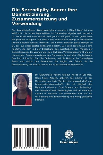 Die Serendipity-Beere (Dioscoreophyllum cumminsii (Stapf) Diels) ist eine Wildfrucht, die in den Regenwäldern im Südwesten Nigerias weit verbreitet ist. Die Frucht wird nicht ausreichend genutzt und gehört zu den gefährdeten Nutzpflanzen in Nigeria. Sie enthält eine beträchtliche Menge an natürlichem Protein-Süßstoff namens "Monellin". Die Samen enthalten große Mengen an Öl, das aus ungesättigten Fettsäuren besteht. Das Buch besteht aus sechs Kapiteln, die sich mit der Bedrohung des Aussterbens der Pflanze, der Domestizierung, der Vermehrung, den flüchtigen Verbindungen im Öl und der chemischen Zusammensetzung des Samenmehls und des Öls befassen. Das Buch informiert über die Bedeutung und die Nutzung der Serendipity-Beere und macht den Bewohnern der Region die Gründe für die Domestizierung der Pflanze und für die industrielle Nutzung bewusst.