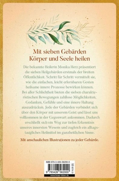 Die Bestsellerautorin und Gebetsheilerin Monika Herz offenbart eine faszinierende neue Methode zur Förderung geistiger und körperlicher Gesundheit: die sieben Heilgebärden. Diese Technik beruht auf traditionellen Ausdrucksformen der Menschheit. Die Gebärden laden uns ein, durch charakteristische Körperbewegungen zu einem Zustand tiefer Erkenntnis zu finden. Die Gesten drücken Empfindungen, Gedanken und innere Haltungen aus und beziehen vor allem Arme und Hände ein. Obwohl sie sanft und einfach durchzuführen sind, ist ihre Wirkung tiefgreifend und kraftvoll. Sie spiegeln archetypische Seelen-Haltungen wie Integration, Abgrenzung, Ruhen in sich selbst und Fokussierung auf ein Ziel wider. Lass dich von deiner Körperweisheit leiten und gelange so zu mehr Selbsterkenntnis und zu Lösungen für konkrete Probleme.