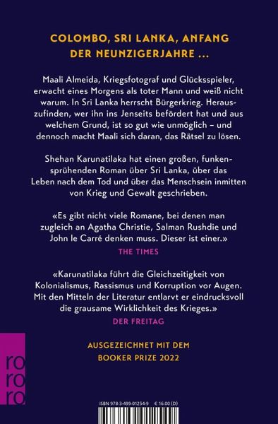 Maali Almeida, Kriegsfotograf und Glücksspieler, erwacht eines Morgens als toter Mann und weiß nicht, warum. In Sri Lanka herrscht Bürgerkrieg, herauszufinden, wer ihn ins Jenseits befördert hat und aus welchem Grund, ist so gut wie unmöglich - und dennoch macht Maali sich daran, das Rätsel zu lösen.