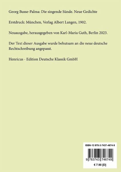Georg Busse-Palma: Die singende Sünde. Neue GedichteErstdruck: München, Verlag Albert Langen, 1902.Neuausgabe, herausgegeben von Karl-Maria Guth, Berlin 2023.Der Text dieser Ausgabe wurde behutsam an die neue deutsche Rechtschreibung angepasst.Umschlagabbildung: Alphonse Mucha, Emerald, 1900Gesetzt aus der Minion Pro, 11 pt.Die Sammlung Hofenberg erscheint im Verlag Henricus - Edition Deutsche Klassik GmbH, Berlin